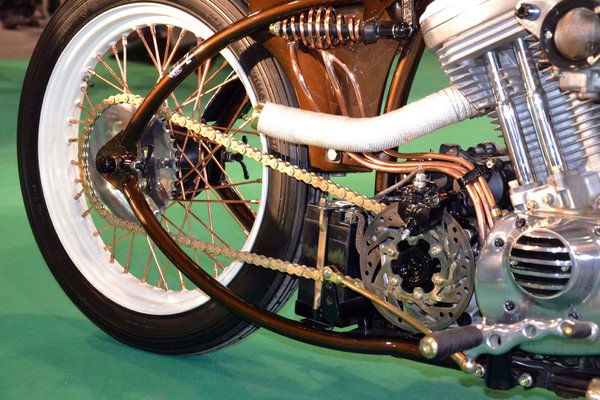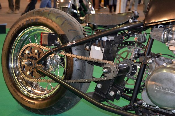 És van ez még trükkösebben is, ennél az átépített 1974-es Kawasaki KZ400-nál például egészen látványosan túlbonyolították: az első lánckeréknél kijön a hajtás, a középső lánckeréknél ott a féktárcsa, majd a szekundert átviszik a motor másik oldalára, és ott egy másik lánckerékpár és lánc hajtja meg a hátsó kereket.