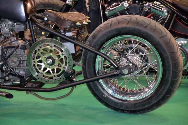 (A barna Harley az Anarchy Custom munkája, a Kawasakit pedig Rácz Attila építette, mind a kettő megtekinthető az AMTS-en.)