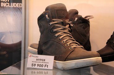 A cipő talán az utolsó, ami az embernek eszébe jut, mint fontos védőfelszerelés, ezért most kezdjük ezekkel. Azt mondják az okosok, ha tudni akarod, mi lesz a menő, nézzed meg, mit hordanak az olaszok. Már pedig állítólag ott most a motoros sportcipő a divat. Úgy néz ki, mint egy szimpla magas szárú teniszcsuka, de merevített a talpa, van benne bokavédő. És tényleg, a nagyobb standokon mindenhol volt két-három új modell, és meg kell hagyni, elég jól is néztek ki. Akinek a motorozás nem életforma, hanem csak közlekedni akar a városban, az hajlamos nem valami bakancsban rohangászni egész nap. Nekik egy ilyen jó kiállású, cipő kinézetű cipő ideális lehet.