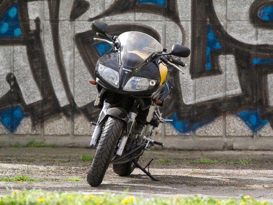 A fékkel nagyjából ugyanez a helyzet, az első Tokico úszónyergek nincsenek a helyzet magaslatán, egyszerűen tompák, rosszul érezhető nyomásponttal, és ezen sajnos a fém fékcső sem segít érdemben. Pedig az SV650 alapjaiban nem igénytelen motor, anyagválasztás terén például kifejezetten imponáló, hogy a váz és a lengővilla alumínium, a teljes kipufogórendszer pedig rozsdamentes acél. Sőt, apró figyelmesség is akad: a tank Ducati Monster stílusban felhajtható, még egy pálca is ott van kitámasztónak, hogy könnyebb legyen szerelni.