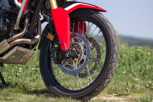 A CRF1000L élőben gigantikus. Először megijedtem, mert középállványon az orromig ér a feláras túraszélvédő. Középállványra később nem is nagyon húztam a 242 kilót, mert nincs külön kapaszkodó a vázon,s eléggé hátra tolták az állvány tengelyét. Az első kerék nem a mostanában szokásos 19 colos, hanem 21-es, akár egy rendes terepgépen, és a hátsó sem a sztenderd 17-es, hanem eggyel nagyobb, pont mint a megboldogult KTM 990 Adventure-ön. Ekkora kerekekkel csak a csatornaépítési munkagödröket nem lehet átlépni, minden mást igen.