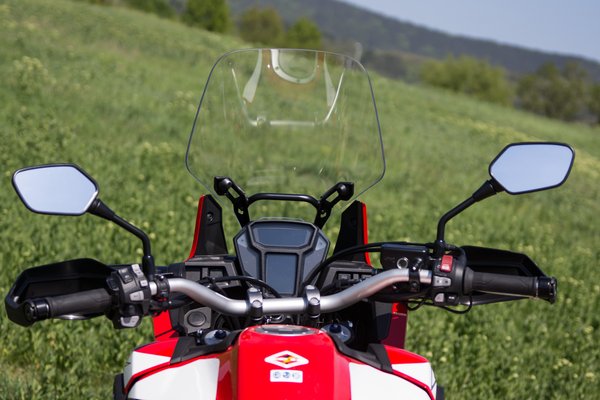 Többször eszembe jutott az osztrák ralimotor, mert a Honda nyúlánk arányai, hosszú rugóútjai és üléshelyzete nagyon emlékeztet a 990-re. Mindkettőn könnyű állva motorozni, közel a kormány, szinte összeérnek a térdek és a tömegeloszlás is arra ösztönöz, hogy csekély terepgyakorlattal is próbálkozzunk az endurózással. Én mégis országúton motoroztam vele, de Ivánnál járt egy hagyományos váltóval szerelt kivitel, bütykös gumikkal.