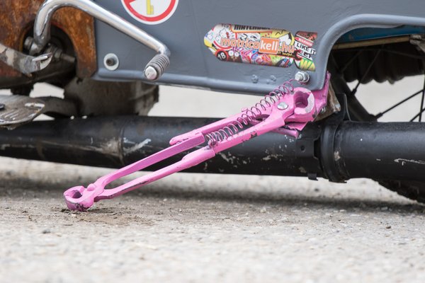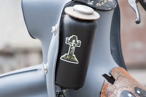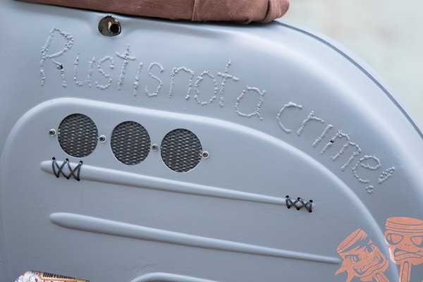 A középső burkolat fémtiszta, már amennyiben a tiszta szót használhatom ebben az összefüggésben, több lépésben lett olyan, amilyen. Patkányos körökben sokan a tömítés-eltávolító sprére esküdnek, de ezt sós vízzel és két szabad ég alatt töltött téllel rozsdásították be. Ez egyébként a legrégebbi rat elem a Schwalbén, ezzel indult az egész, mégsem ez a fő büszkeség, hanem a hegesztőpisztollyal pöttyözött feliratok.