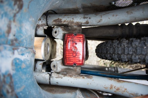 A lámpa gyári, csak kapott egy sárga fóliát, fölötte viszont behegesztették a gyújtáskapcsoló és az óra helyét. Ez egyébként meglepően nehéz feladat volt, ugyanis a 39 éves másfeles lemez mára jó ha az egyes vastagságot kiadja, a CO gépet pedig nem tudták olyan alacsony áramra tenni, hogy ne égesse át. Végül mögé varrtak egy másik lemezt, kívülről pedig bevakolták.
