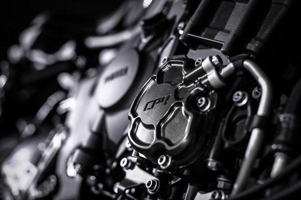 Más a hengerfej (kisebb kompresszió-viszony, szelídebb vezérlés) és a dugattyúk, kisebb átmérőjűek a szívószelepek, a keresztsíkú főtengelyen 40 százalékkal nagyobb a lendtömeg. A hajtókarok és a kipufogó szelepek sem titánból készülnek, de a kétezerrel lejjebb költözött leszabályzási fordulat és a mínusz negyven lóerő miatt nincs rájuk szükség. Ezeken kívül megnövelték az airbox térfogatát, és elhagyták a másodlagos befecskendezést. Az így jelentkező 160 lóerő és 111 newtonméter még valahol az ésszerűség határán belül van. A kipufogórendszernek csak a leömlői készülnek titánból. Gyári állapotban is élvezhető a crossplane-elrendezésre jellemző rekedtes mély hangzás, azonban az egyetlen kék példányra szerelt Akrapovic dob sem volt számottevően hangosabb.