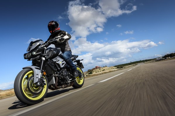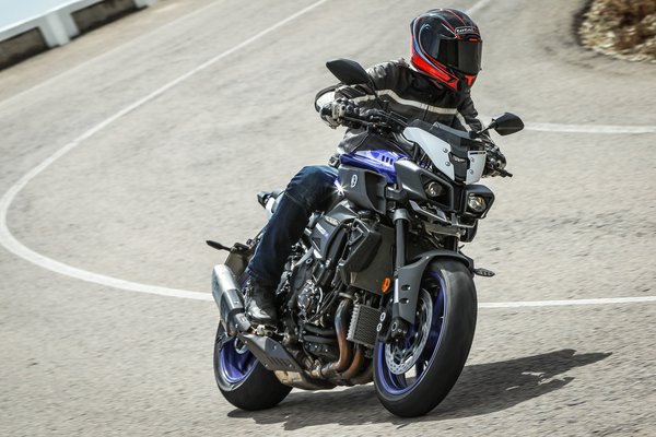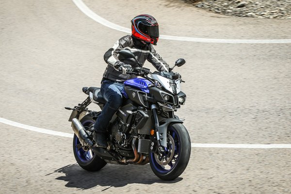 A vizes úton megtett első kilométereken aztán gyorsan kiderült, hogy a sok egyszerűsítés nem egy herélt blokkot eredményezett. Míg az R1 kvázi használhatatlan utcán, az MT-10 már kevéssel alapjárat felett sem rángat, a laza krúzolás sem esik nehezére. De ha rendesen eltekeri az ember a kissé túl könnyen mozgó elektronikus gázmarkolatot, a rövidebb végáttétel miatt (41-es helyett 43-as lánckerék) minden fordulaton robbanékonyan viselkedik. Azért egy picivel rövidebb egyest elbírna, mert jelenleg 130-ig tart. A teljesítmény-leadás nagyon lineáris, nyomaték meg van bőven. Kevés mai motor emelgeti gázra ilyen lazán az első kerekét az alsó sebességfokozatokban.