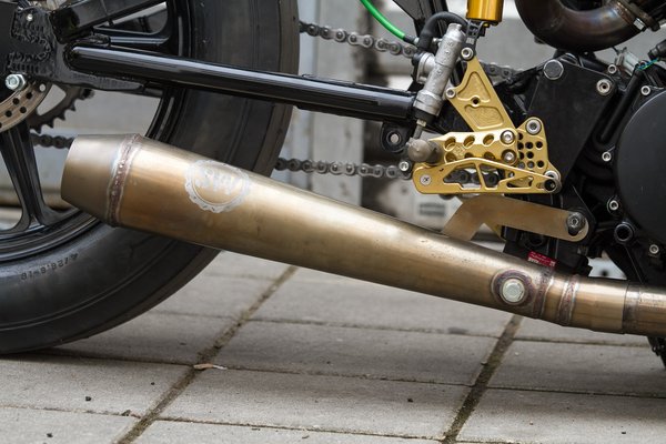 „A blokkot az ügyfél építi, én csak a futóművet, a kipufogót és a külsőségeket rakom hozzá. A kovácsolt alumínium kerekek a PVM-től érkeztek, az első villa Yamaha R6, a kettő az egybe kipufogó viszont az én művem. Padon szoktuk mérni a rendszereinket, a széria 50 lóerőre úgy további 5-6-ot dobnak rá.” – mutogatja a részleteket – „Ez egy nyugis blokk lesz, olyan Buell karakterisztikájú, inkább nyomatékos lesz, mint pörgős.”