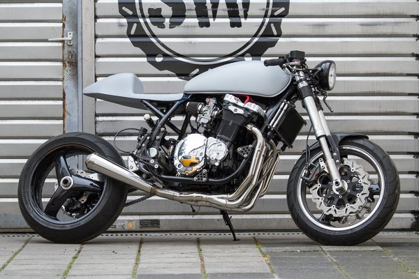 Noha a TR a fő műsorszám, a műhelyben sorakoznak a félkész munkák. A szemem megakad egy GSX-R1100-on, ám mintha a váz nem stimmelne. Thomas legyint, hogy azzal ne is törődjek, mert nehéz és hosszú lesz. A váz eleve egy Z1000-es Kawasakié, ami már a maga idejében sem volt elég merev a 80 lóerős blokkhoz, a 70 lóerővel durvább Suzuki blokkhoz meg pláne nem. Persze javít, hogy a motor eleje egy Ducatié, az egykarú lengővilla pedig egy Triumphról jött, de Thomas a súlycsökkentés elkötelezett rajongója. Ott van például a saját Kawasaki W650-ese – a királytengelyes Kawasaki amúgy is a kedvenc típusa.
