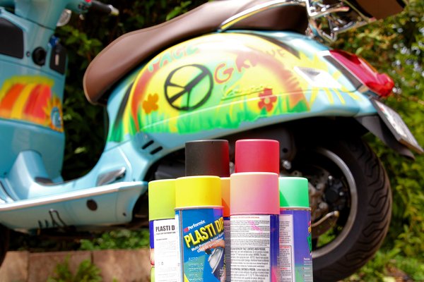 Ezekben a fújható-kenhető fóliákban az a jó, hogy tartós, de akár egyben, rugalmas filmrétegként vissza lehet szedni a felületről. Tehát annyiszor fényezhet át az ember egy motort, autót, hűtőszekrényt, ahányszor csak akar. Más kérdés, hogy azért semmi sem olyan egyszerű, mint elsőre tűnik. Mert maszkolni itt is kell, hiszen rejtett ficakokba nem akar az ember festékködöt fújni, a dombornyomott ülést sem akarnám összemaszatolni. Folpackkal beterítettem, amit nem akartam lefesteni, kartonból vágtam kis virág, meg szöveg sablonokat, aztán gyeröönk.