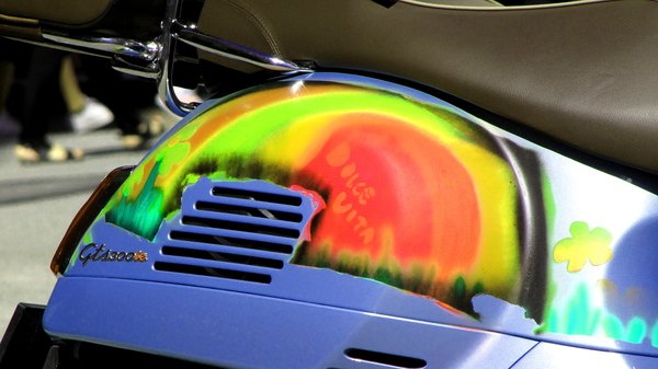 Az, hogy a harlitalálkozó tiszteletére kormányhínárt aggassak rá, már tényleg kezd annyira kellemetlenül elcsépelt, saskabarés poénná válni, hogy már én szégyellem magam a pár évvel ezelőtti miatt (még akkor is, ha továbbra is szép számmal látni bőrrojtokba öltöztetett motort és motorost). De ha az ember felidézi a Szelíd motorosokat, abban szabadság van, meg hippik, meg extázis. Egy hippi Vespa, hmm, nem is rossz. Csak le kell festeni, kis virágok, napocska, szivárvány, ilyesmi. Egy ilyen scooter teljesen megállná a helyét a Captain America, vagy a Billy Bike mellett.