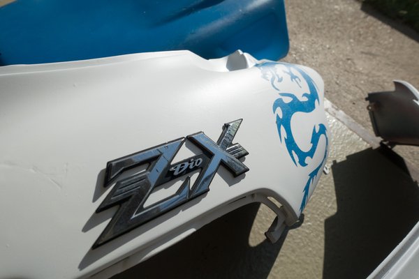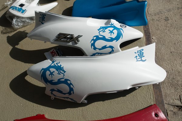 Fehér, naná, hogy fehér kell. Az egyik legszebb versenyszín, selyemfényű matt, némi selyemfényű lakkal. Kicsit szemetes lett, sebaj, néhol látszik a megfolyás, mert mindent nem tudtam visszacsiszolni, de – különösen a fejidommal – elégedett voltam. Megmentettem a típusjelet is, pedig az a 20 éves ragasztó nagyon nem akarta engedni magát. A szerencse-kandzsi (japán, nem kínai) kellett rá, ahogy a japán (nem kínai) sárkány is, ami az erőt és a bátorságot szimbolizálja. Mondjuk a kandzsi megszopatott, mert türelmetlen voltam és nem milliméterenként körömollóval vagdosva, ív-irányban húztam le, így néhol magával hozta a fehéret is. A fehéret nem érdemes elkapkodni, legalább 3-4 réteg az ideális, egyszerre egy vízszintes és függőlegesnél nem szabad többet fújni. Nem nehéz kiszámolni, hogy 4 napig készült a fehér rész pont emiatt, plusz ugye a lakkozás, ami majd – elméletileg – ellenállóvá teszi. Bár nem az aszfalttal szemben.