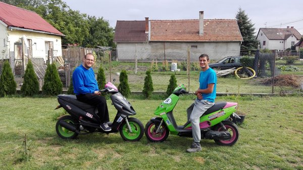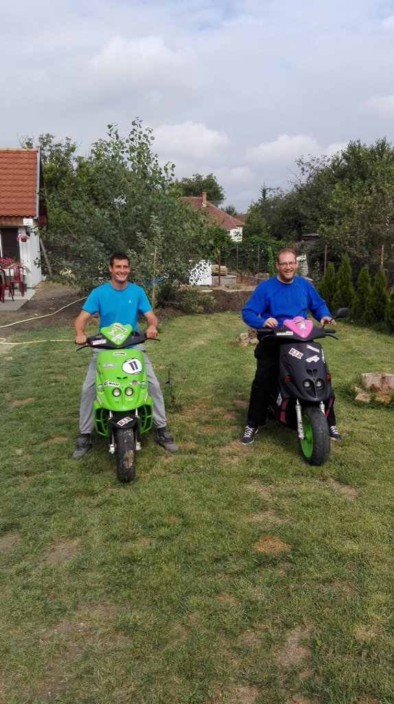 Frpeter: a csapat húzópilótája, legalábbis ha valamit húzni kell (mondjuk a motort ki az árokból). Kíváncsian várjuk mit fog mutatni az 50-es órája közel 120kg alatt. Amúgy alkatrészekkel foglalkozik már pár éve, úgyhogy ha csak nem törjük össze magunkat, vagy áll be a blokk, talán minden másra fel vagyunk készülve. A robogó-szereléshez nem sokat ért, bár a blokkot meg tudja különböztetni a keréktől, de a blokkon belüli mutatványokat a gyakorlottabbakra bízza, ő inkább bont egy sört (gondolom valaki olyannak, aki nem versenyzik - a szerk.). Megjárt már pár szerpentint motorral, de a versenypálya nem az ő világa.
