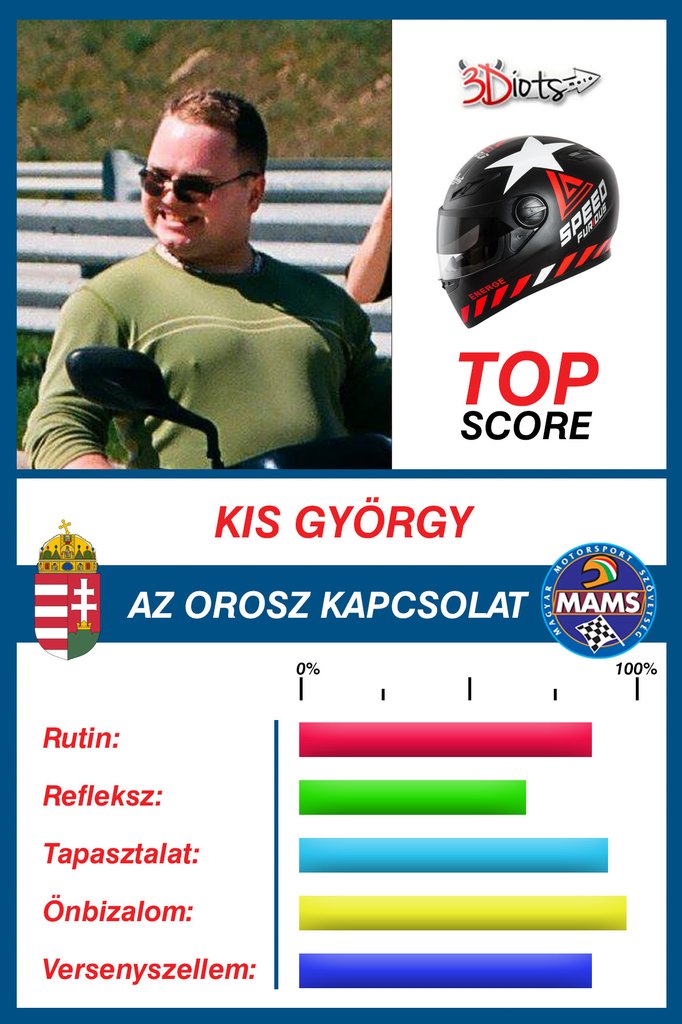 Kis György: Alias KicsiJuruj. Az orosz kapcsolat. Egy év alatt még tökéletesebbre csiszoltam tapasztalataimat az 50-es robogók területén. Rájöttem, mire jók a rugók, a súlyok, a rezonátor, a nyitott légszűrő! De minek is? Ez itt nem erről szól. A régi iskolát követem. Kinyitom a hölgyek előtt az ajtót, átadom az ülőhelyem idősebbeknek a metrón, és csak berúgós motort veszek. Szörnyen hagyományőrző ember révén, a megszokások rabja ként idén sem tudtam kimaradni a 35 fokban körözők táborából!