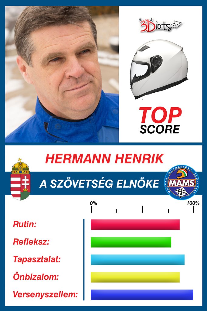 Hermann Henrik: A szövetség elnöke, az erő birtoklója. A motoros társadalom koronázatlan királyaként számos területen kipróbálta már magam. Hatalmammal nem visszaélve, technikai tudásom csillogtatva ismét bizonyítom, hogy nem a súly teszi a motorost, hanem a tömeg, ami kanyarokban jobban csúszik a gumikon, de akár lapján is! Jelszavam: Győzzön a jobb, vagyis mi! És a verseny a célig tart!