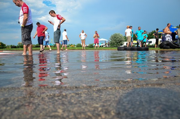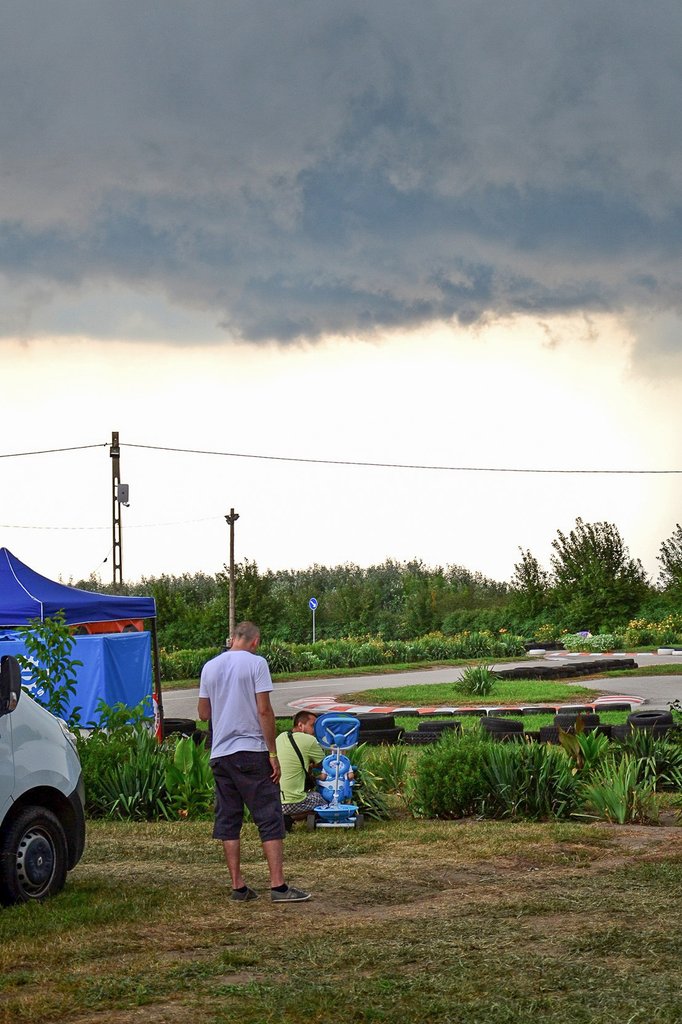 A vihar bődületes erővel csapott le, majd fél óra múlva távozott, mi viszont ott álltunk egy víz alá merült pályával, amin a hátsó kanyarban térdig lehetett gázolni. A csapatok viszont nem estek kétségbe, pillanatokon belül a lézengő emberek elkezdtek árkot ásni, seprűvel és vödrökkel elhordani a tócsákat – rajt előtt 10 perccel már száraz volt az aszfalt, a vihar által leszaggatott leveleken és a pályára mosott homokon kívül semmi nem emlékeztetett arra, hogy nem is olyan régen leginkább jetskizésre tűnt alkalmasnak a Bognár Gokart Park.