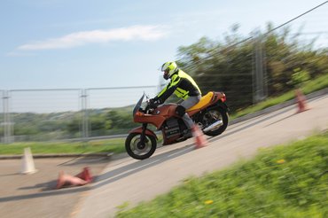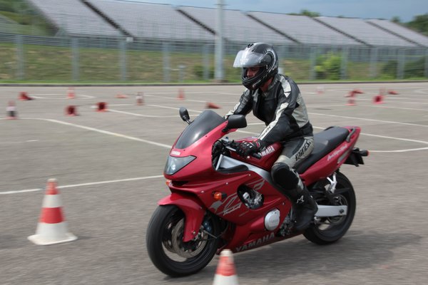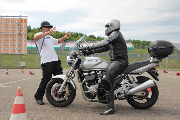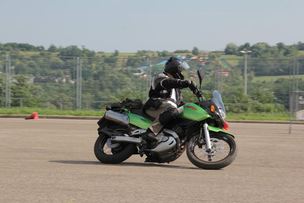 Ráadásul a fékezéses gyakorlat éppen az, aminél nagyon jól jön a külső szemlélő, aki megmondja, mit csináltunk rosszul: például hova néztünk, hogyan építettük fel a fékerőt, hova helyeztük a testsúlyt - és így tovább, nem számoltam pontosan, de vagy 5-6 féle jellegzetes hibát figyeltem meg. Magamról is tudom, máson viszont sokkal jobb volt megfigyelni, hogy milyen az, amikor valaki nem mer rendesen ráfogni az első fékre, és a motor eleje alig ül össze, de már füstöl a hátsó kerék.