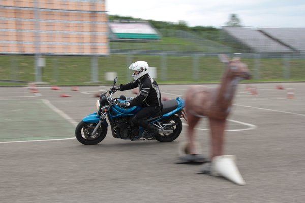 A második fontos gyakorlat, az elkerülés akkor értékelődik fel, amikor a fék már egészen biztosan nem elég. Instuktor Robi el is mesélte, hogy rengeteg baleset azért következik be, mert a motorosok 90%-a nem hajlandó elengedni a féket vészhelyzetben, inkább telibe veri az akadályt, mint hogy elvegye róla a kezét, és beiktasson egy elkerülést.