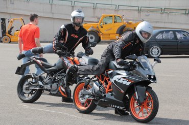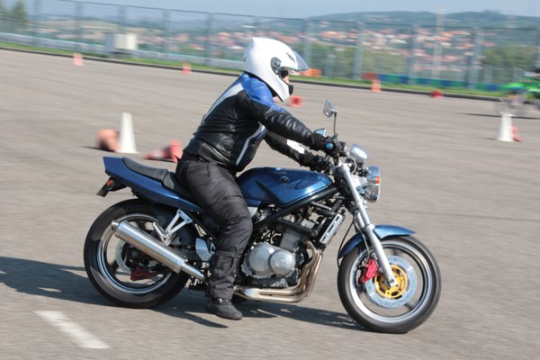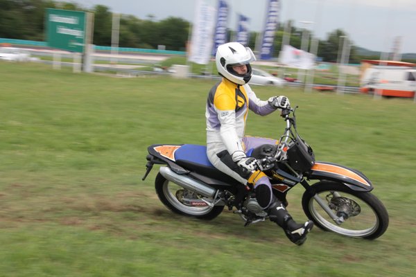 A fékezős gyakorlatok és a szlalom mellé extrának bekerült még egy gyors offroad kóstoló is, terepgumival szerelt 125-ös endurókkal lehetett megtapasztalni a kontrollált csúszást. Becsapós volt, mert a bütykös abroncsok nagyon durván fogtak, még a friss füvön is rá kellett tenni rendesen a gázt, hogy megmozduljon a motor hátulja, tehát egészen más élmény volt, mint azoknak, akik a saját motorjukkal próbálták meg.