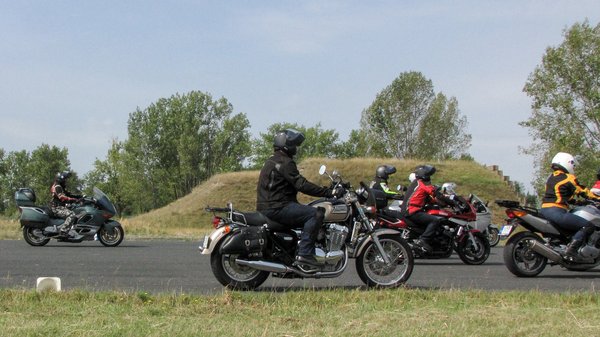 Közben kiderült, a csapatból többen is jártak már tréningen, de a Drivexén még senki, úgyhogy ez lett a kiválasztott tanfolyam. Férfiak és nők vegyesen voltak a társaságban, jellemzően túramotorokkal. A BMW felülreprezentált márka volt, de volt köztük mindenféle korú és hengerszámú, illetve akadt azért Triumph Thunderbird, meg Honda CTX is – nem volt egyhangú a sor, na. Két-három motort leszámítva viszont mindnek volt ABS-e, ezekkel könnyebb volt a vészfékezős manővereket megcsinálni.
