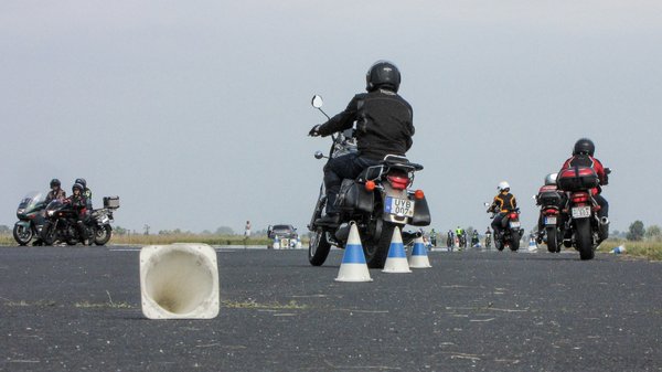 Mikiék már javában túl voltak a bemelegítő gyakorlatokon, a le-felszálláson, kétujjas motortartáson, sőt, a hülye pózokban motorozás is lezajlott, mire leértem Kiskunlacházára. Éppen lassúsági futam ment: a feladat csak annyi, hogy az nyer, aki legutoljára ér célba, lábletétel nélkül. Látványosan szétszóródott a csapat, sokan nem tudtak lajhárüzemben araszolni, de ez senkinek nem szegte kedvét, jöhetett a szlalomozás.