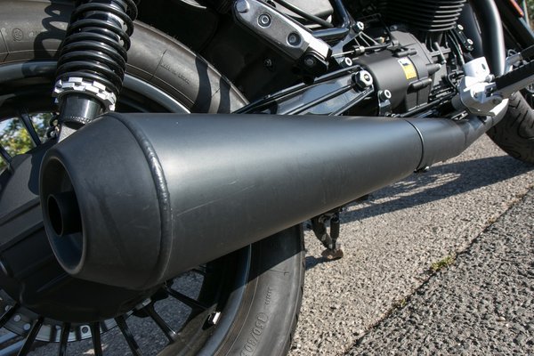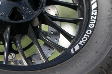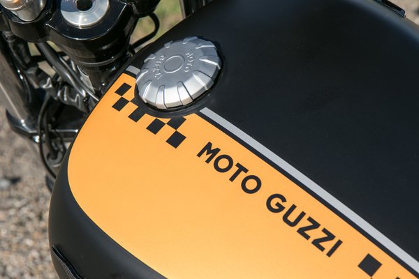 Domináns a matt feketére felnyalt matricázás, amelynek okkeres narancsszínét csak olasz lélek álmodhatta meg, és megható a hasítottbőr-szerű nyereg is a hímzett márkajelzéssel, de mit sem érne a művészi játszadozás a felületekkel, ha nem lennének azok a húsos gumik ilyen káprázatos, sűrű küllős, Moto Guzzi-feliratos felnikre húzva vagy a kipufogó nem volna ilyen vaskos a maga feketeségében.