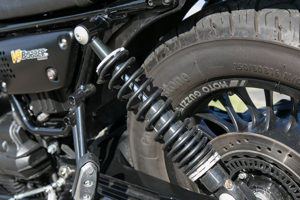 Naiv, aki ezektől a combnyi vastagságú gumiktól fordulékonyságot vár, de a V9-es bizonytalansága kanyarban mégis zavarba ejtő. Persze ha végiggondoljuk, hogy ölünkben egy jól megtermett V2-est cipelünk két vékonyka perec közé fogva, elöl két szalmaszállal megtámasztott kerékre támasztva, nem kell csodálkozni a tétova mozgásán. Csak az az érthetetlen, miért hangolták olyan kegyetlenül feszesre a fura szögben álló rugós tagokat, hogy az elpattogó hátsó kerék miatt egy közepes kigyorsításnál is beavatkozzon a kipörgésgátló.