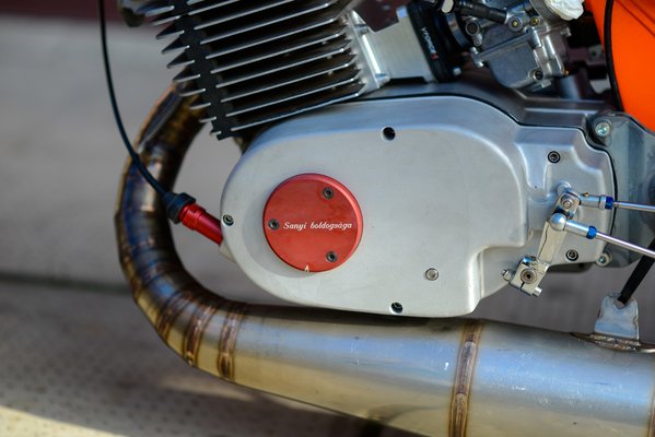 Milliókat nyilván senki sem költene ilyen hülyeségre, de százezreket szerintem szinte bárki elköltene pár plusz lovacskára. Sándor ebben nem hisz, és kicsit tart is a trollrohamtól, hogy mi az, hogy 35 ezer a dugattyú, 40 a karburátor, 120 a membrán a membránházzal, 80 a gyújtás, 100 ezer pedig a felömlőcsatornák kialakítása, meg a többi gépmunka. Nem beszélve a kipufogóról, ami további 50 ezer, de azt nem számolja bele, mert a műszakin azzal nem menne át a motor, tehát utcára nem ajánlaná. „Minimális költségből, mondjuk százezerből kb. 28-30 lóerős motor építhető, 50 LE-s egy MZ-n már komoly átalakítások kellenek.