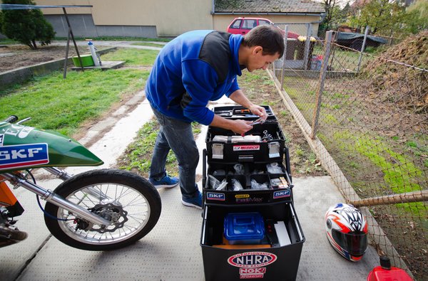 Sándor szerszámai végsőkig szakszerű, ám nem túl fotogén-vadregényes módon mind elférnek egy húzható ládakészletben. Versenykörülmények között is mindent meg tud szerelni ennyivel. „Ez a harmadik blokk, amit használok, meg még amit itt látsz”. Nem látok semmit. Minden el van rakva, de gondolom, lapít pár alkatrész valamelyik fiókban. A gyári MZ meg azért áll itt, hogy egyrészt legyen, másrészt bár Sándor keveset van itthon, a gyermekkori házban, az édesanyjánál itt Újszászon, azért néha elmegy vele egy körre, hogy kiszellőztesse a fejét.