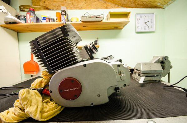 Maga a műhely, mármint Sándor műhelye lelohasztó, amennyiben valaki hangulatos fotókat szeretne készíteni a mohos gerendák között átszűrődő kora téli napfény játékáról a rozsdás harapófogókon. Ez itt nem olyan. Nem tudom, miért, de az jut eszembe, mennyivel többre vitte volna az iszlám állam, ha a bombagyárosai ilyen tiszta környezetben dolgoznak. Sándor itt amúgy is csak a kiszerelt blokkot javítgatja, most is húsz perc alatt kikapja, miután mindketten mentünk a motorral egy kört. Illetve a pontosság kedvéért két egyenest, mert a felsorolt anatómiai jellegzetességek miatt kanyarodni ezzel nem lehet.