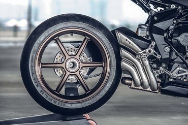 A hatalmas burkolat miatt alig látszik az Öhlins FGR villa és a Beringer fék. A már említett kipufogó a HP Corsétől származik, és csodálatos, ahogyan a három tölcsér leköveti a hátsó kerék ívét - az egykarú lengővillának köszönhetően a jobbos nézetből így tökéletesen érvényesül a hátsó kerék.