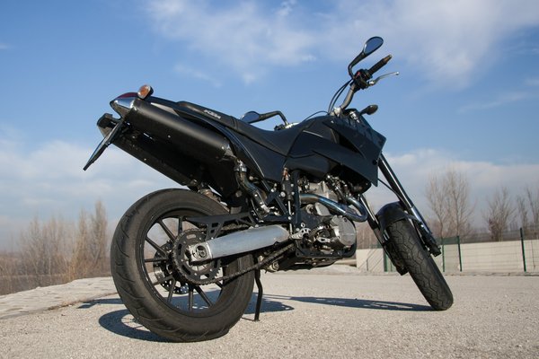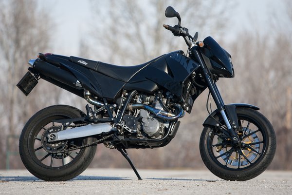 Maradva a minőségi részleteknél, ott van a Duke II láncfeszítője, amivel a motor magasságát és tengelytávját is állíthatjuk, így finomhangolhatunk a pengén forduló szupermotó és a jó egyenesfutású utcai motor között. Aztán ezt a megoldást a 690-esnél már elhagyták, mert az illesztett alkatrészek nagyon megdobták a lengővilla gyártási költségét. Az elkurvulás modellcikluson belül is tetten érhető volt, a fekete blokkosnál még egy Y-cső osztotta szét a két kipufogó előtt az égésterméket, a szürke blokkhoz már gagyibb T elágazás tartozott. Az Y pedig a hozzá tartozó karburátor alkatrészekkel feláras tuningkit lett, ami 4000-es fordulat felett ad egy kis erőt, jobban veszi a fordulatot a motor, és szebb tőle a hangja. Hát kösz.