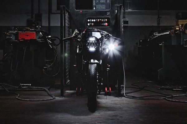 Első ránézésre ütős, a néhány ujjlenyomatnyi piros csíktól eltekintve teljesen feketére fényezett motor összhatása kiadja, még ha van egy-két olyan nehezen értelmezhető elem, mint például az esőmintás pályagumi, a villa aljára helyezett kiegészítő fényszóró, vagy az ülés alatti billenőkapcsoló.