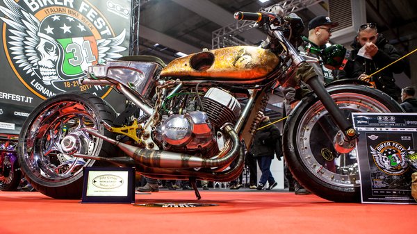 A veronai motorexpót mindig úgy képzeltem el, mint egy mini-Yokohama összejövetelt, ahol Európa legmenőbb custom királyai felvonulnak egy pacsira, és estére alaposan berúgnak. A valóság ettől nem is áll távol. Záróra előtt néhány perccel az átépítőműhelyeknek szánt csarnokrész a Horgony MC éves találkozójává változott, ahol mexikói orrú western csizmában tomboló népek forgatták ujjaikon az előbb még eladásra kínált cickányfarkat. Egyébként is volt itt minden, feszülettől kezdve halálfejes gördeszkán át húsz eurós diszkont bukósisakig.