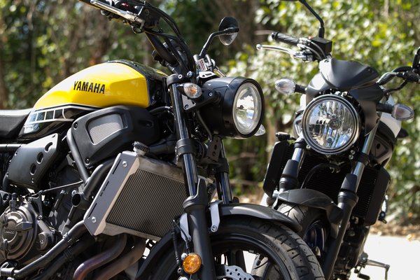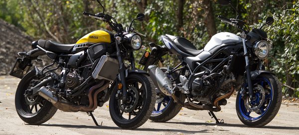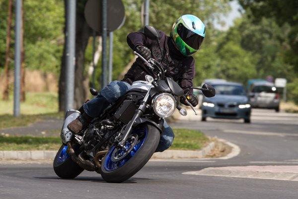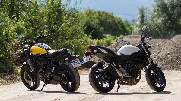 A Suzuki futóműve feszesebb, kicsit ugyan sprőd, sok tartalék nincs is benne, de az is több, mint amit az XSR fel tud mutatni. A Yamaha eleje egyértelműen lágy és alulcsillapított, Papp Tibi szerint a hátuljának a lifegése is túlmutat a kényelmes hangoláson. Rossz úton az XSR egy megváltás az SV-hez képest, gyors, váltott kanyarokban, erőszakosan átdobva viszont éppen a Suzuki az, ami nem esik le az útról.
