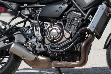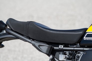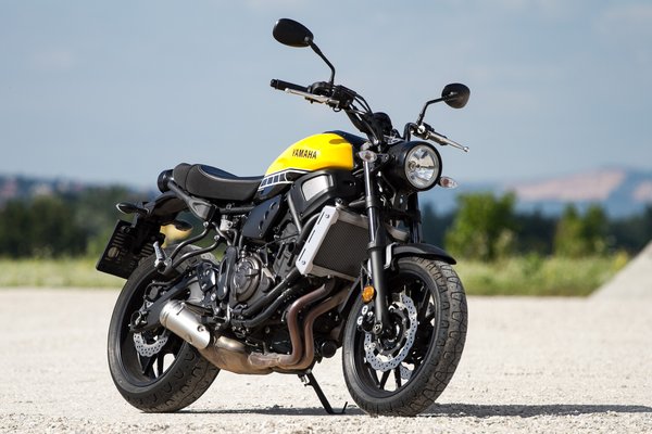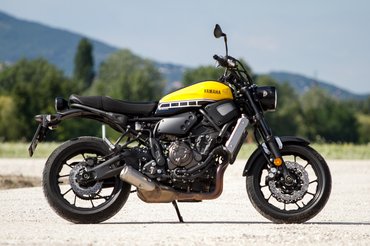 A Yamahánál figyeltek a részletekre. Az évfordulós tankfényezés telitalálat, sokadik tesztmotornál sem untam rá a sárga-fekete-fehér kombinációra. A lengővilla csodálatosan kidolgozott, modern szobor öntött alumíniumból, a blokk alá húzott kipufogó is izgalmasabb, mint egy kazánszerelő által tervezett, oldalt meredező bélelt kémény. A blokk látványa viszont cseppet sem érdekes, inkább egy barnára eloxált deklivel próbálták elterelni a tagolatlan fekete hengerekről a figyelmet. Hatalmas bénaság ez így, egy naked bike-ban a blokknak főszerep jár. Ettől még az XSR formai fölénye az utólag odakúrt hatású hűtő ellenére is látványos, a felnik, a régies mintájú gumik, a fekete bevonatú becsúszószárak, a hosszúkás, kisebb átmérőjű első lámpa, a trackeres szabású ülés mind-mind olyan apróságok, amiktől a Yamahára könnyű rákívánni.