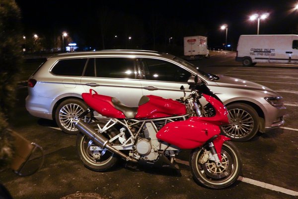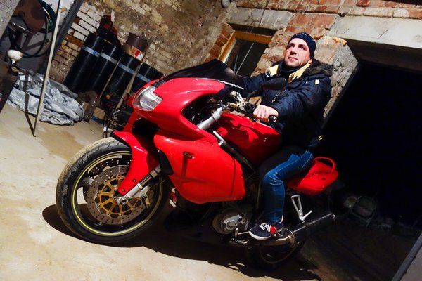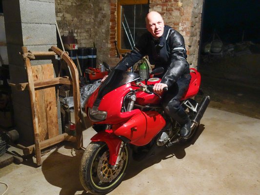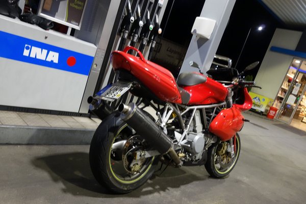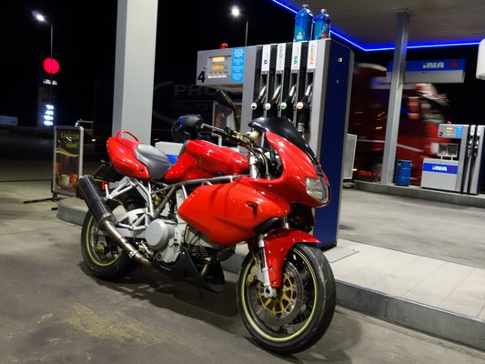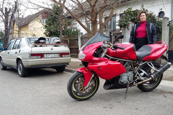 Nem kezdődött jól ez a barátság. Tovább romlott, amikor indításnál rá akartam tenni a szívatót (ami itt csak egy alapjárat-emelő, mert a motor befecskendezős), s az eladó megjegyezte - „felesleges, ki van kötve, anélkül is szépen indul”. Hogyhogy? Hiszen az nem ok nélkül van ott... A másik Ducatin nagyon is szükség volt rá. Nem értettem, de tény, hogy alig két-három fordulat után bepöccent és gyönyörűen dübörögni kezdett. Féltem, hogy nagyon hangos lesz, de egész tűrhetően dörmögött, csendesebb volt, mint a szintén utólagos dobokkal szerelt ST2 volt. Ennyi belefér, csak ne csattogjon.