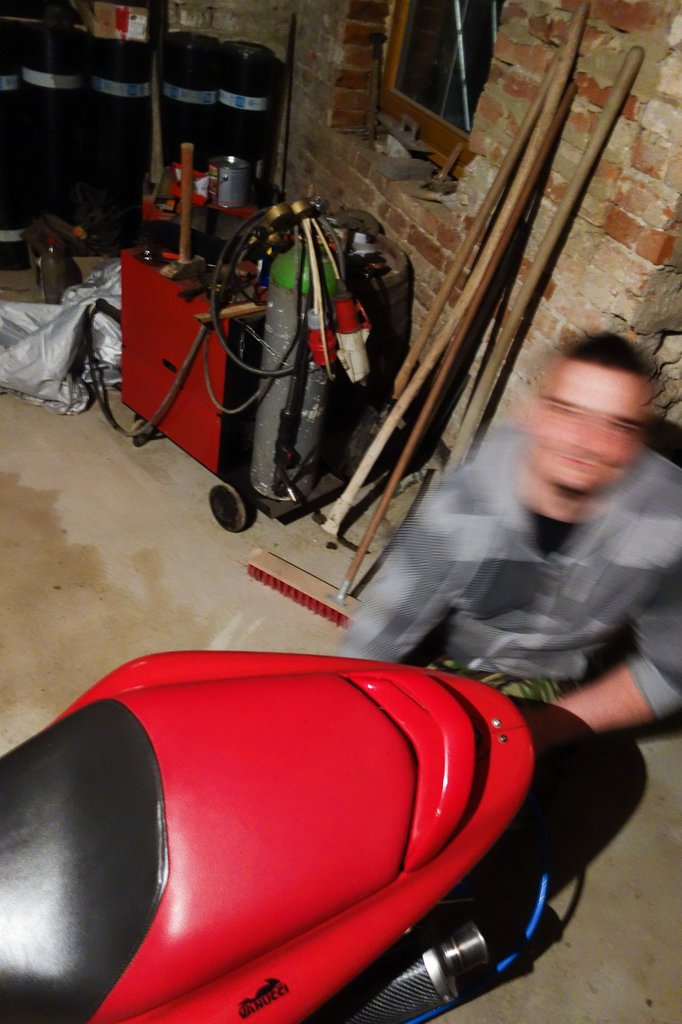 Itt is egy szimpatikus eladó fogadott. Őnála is picik a gyerekek, ráadásul a ház is épül, a garázs még éppen csak álldogál, ducatizni végképp nincs idő. Egy szál pőre izzó gyúlt, s felvillant előttünk a Test. Egy 2001-es gyártású 750SS Nuda, az a verzió, amelyiken legalul nincs idom - a legszebb dög. Basszus, azért az SS, a sportmotor (tehát ez) sokkal-sokkal szebb jármű a nagytestű, erősen burkolt ST2-nél (amit korábban vettem). És milyen könnyű! Ráültem, és ahogy függőlegesbe húztam, mintha valami üreges testet emeltem volna – de hiszen az, nincs benne semmi, csak egy levegős térhálós váz, egy mélyen lent levő blokk és némi vékony műanyag itt-ott.