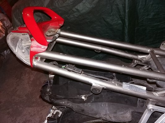 Így alakult, hogy nagyjából az első befejezett munkába/-ból út után neki kellett látnom a szerelésnek otthon a garázsban. Lebontottam a motor farán az idomokat – amúgy rendkívül szép a kidolgozás, az a váz egy csoda, a burkolatokon jó vastagok a pöcsök, amik tartják, szépen bekattan minden, a csavarokon is gyönyörű a bevonat. Rájöttem, mi történt.