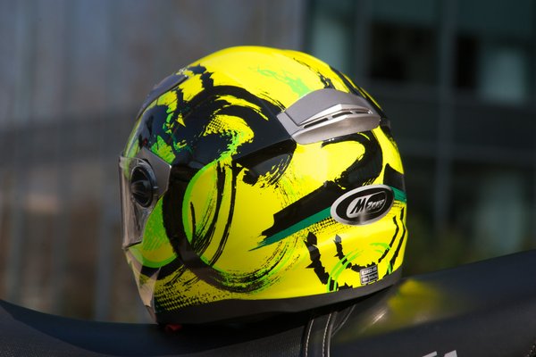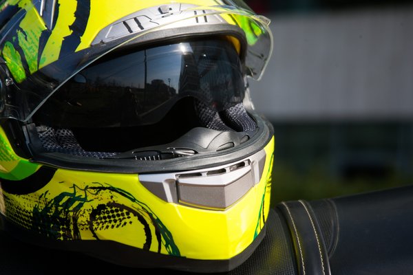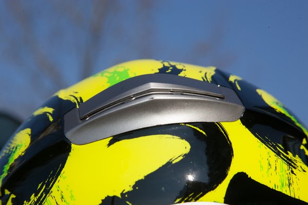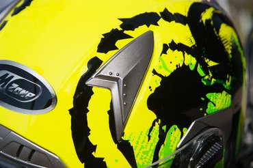 Megfelel az ECER 22-05-ös előírásnak, az állszíjon ott az E-jel, ha valami ezzel nem rendelkezik, azt megvenni is tilos, nemhogy forgalomban használni. A láthatósági szín ötven százalékban szintén biztonsági extra, a mintája is pofás, bár a jegyzőkönyv kedvéért legyen meg, hogy technikailag nem festés, hanem fólia, ez a kis karcokkal szemben ellenálló, illetve később fakul ki az UV sugárzástól, mint egy silány minőségű fényezés. Az olcsóság itt tetten is érhető, a szellőzők mellett látható pár apró gyűrődés.