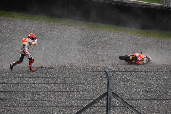 Márquez hozta a kötelezőt, az edzéseken bravúrosan motorozott, és már az első körökben úgy meglépett a mezőnytől, hogy a test-test elleni küzdelemre egyre kevesebben voksoltak. Egészen addig, míg egy váratlan fordulatban a Honda eleje el nem ment, még egészen a féktáv legelején, egy olyan ponton, amely teljesen valószerűtlennek tűnt. Márquez ritkán hibázik ilyen béna módon, így hamarosan megkezdődtek a találgatások. A spanyol senkit nem okolt magán kívül, de az új összetételű abroncsok talán egyre több csapatnál kérdéseket vethetnek fel.