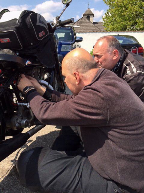 Aztán egyszer csak rendszáma lett a motornak, én meg kitaláltam, hogy akkor a beavató próbája az legyen, hogy kimegyek vele a weissenkircheni veteránmotor- és -kisautó hegyi felfutó versenyre, oda, ahová 1990 óta kvázi minden évben kijárok. Ehhez az ötlethez társnak pedig elhívtam régi gimnáziumi barátomat, Endrét, aki tavaly vett Németországból egy 1951-es gyártású NSU 251 OSL motort. Neki ugyan volt vizsga a motorján, de egy nagyon bácsi-bácsitól vette, aki láthatóan a saját garázsában, saját nem különösen nagy hozzáértésével szerelte a motort. Láthatóan nem voltak vele világhódító tervei, annyira működőképessé tette, hogy legyenek rajta gumik (azok újak!), fékek, világítás és fényezés, kicsit lekente kályhaezüsttel egyik-másik krómot, de a lígő-lógó vezetékek, szigetelőszalagos megoldások, laza és hosszúra hagyott bovdenek, ezer egyéb arra utalt, hogy legfeljebb a szomszéd falu oda-vissza távon gondolkozott a motorral.
