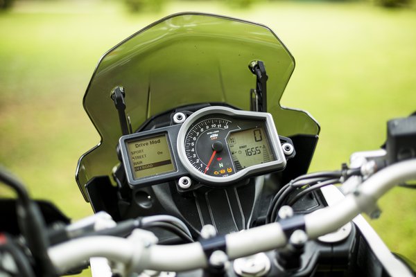 Érzetre sokkal tömörebb, mint a 1190, 200 köbcenti és 9 kiló a különbség, de nagyon máshogy mozog. Sokkal mélyebbről indul meg, és a terepes 100 lóerős módban lényegesen kisebb a kihasználható fordulatszám. De minek is fordulat, ha a hatalmas V2-est éppen csak megröfögtetve bármin keresztültúrja magát, a nyeregből kiállva, az ívbelső lábtartóra terhelve csak húzni kell a gázt, és már indul meg a feneke, szépen utána lehet menni kormánnyal.