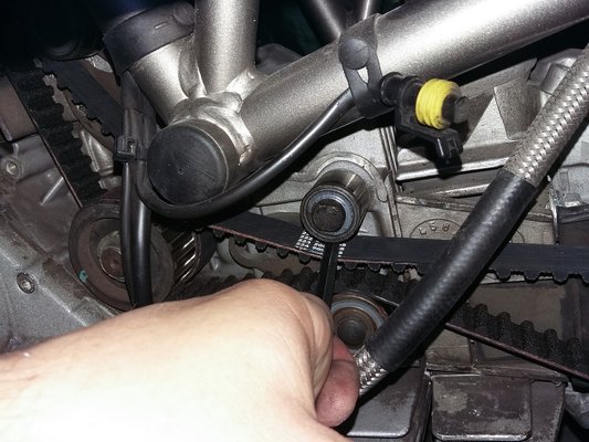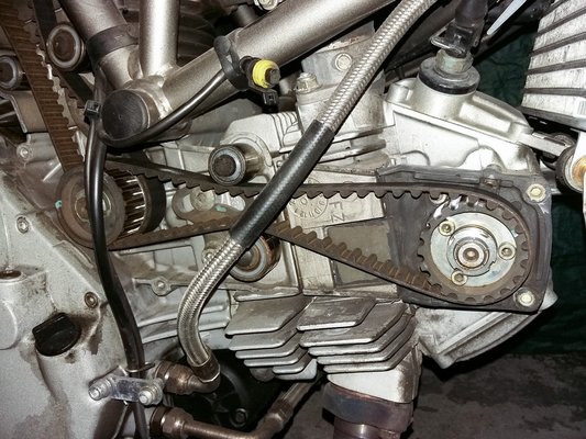 A Ducati-szíjfeszítésről rémisztő legendák keringenek, mindenféle pengetés utáni mikrofonos-hangvillás-oszcilloszkópos állításról, mert ha nem így tesz valaki, túlfeszítés esetén szétmegy a veztengely csapágya, túl lazára hagyva meg átugrik. Hát az enyém elég laza volt, csináltam is róla egy videót, nem tudom, hogy látszik-e, a szíj a vezérműtengely tárcsája után nem visszafelé hajlik a görgő irányába, hanem még kicsit felfelé indul; több centit lógott. Én meg így motoroztam vele vagy 600 kilométert.