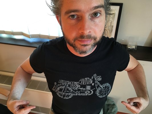 Csak álltunk ott mellette Karottával – aki nem tudhatta még reggel; de az alkalomhoz illően öltözött, menő motorkerékpáros póló volt rajta, szerintem egy TS250-t ábrázol a sematikus mű – és szívtuk magunkba a tárgy szépségét.