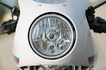A fejidomról lehet vitatkozni, egy nap nézegetés után már határozottan tetszett. Konkrét előképet nem nagyon találtam, a hetvenes évek bármelyik félburkolt BMW-jét bele tudom látni. A Rumcájsz-pisztoly alakú kipufogóból szokatlan szerénységgel eggyel is beérték, üdvözlöm a mértéktartást, ezektől lett tiszta a formaterv. Az ülés kényelmes, sokkal jobb annál, mint amire ránézésből számítottam – okos optikai trükk, hogy a homokóraalakban futó varrás miatt keskenyebbnek és sportosabbnak tűnik.