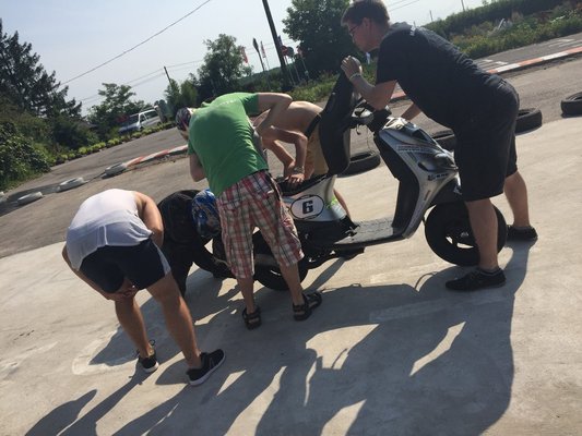 Az hamar eldőlt, hogy a Joggal még egyszer nem fogunk nekivágni a versenynek, elég volt a kis törékeny műegyetemista lelkivilágunknak egyszer az az emocionális hullámvasút, amit a matekvizsgák kis Yamaha menet közbeni kisebb-nagyobb hibái okoztak. A csapat magja az előző tavaszi félévben elég nehéz vizsgaidőszakkal nézett szembe, ezért a saját építés helyett úgy döntöttünk, hogy az egyik támogatónktól bérlünk egy csodálatosan felkészített Piaggio Zipet. A választás jól sikerült, egy nagyon pöpec kis kétkerekűt kaptunk, amivel az összes gondunk (a végére szálig kopó abroncsokon kívül) annyi volt, hogy későn került hozzánk, így a pilótáink csak a verseny második felére ismerkedtek meg vele. Idén több időnk és energiánk volt a felkészülésre, ezért egy korán felmerülő lehetőségre lecsapva időben beruháztunk a márkahűség jegyében egy másik Piaggióra. Egy kétütemű Liberty-re (név szerint P. Barbira, ahogy a csapat elnevezte, kedvenc magyar instagram modellünk után). Tennék szívesen frissebb képet róla ide (mármint nem Palvin Barbiról, hanem P. Barbiról), de éppen jobban szét van szegény esve, mint a magyar válogatott védelme, ezért csak ez a kezdetleges, nagyon rosszfiús képet tudtam ide becsatolni.