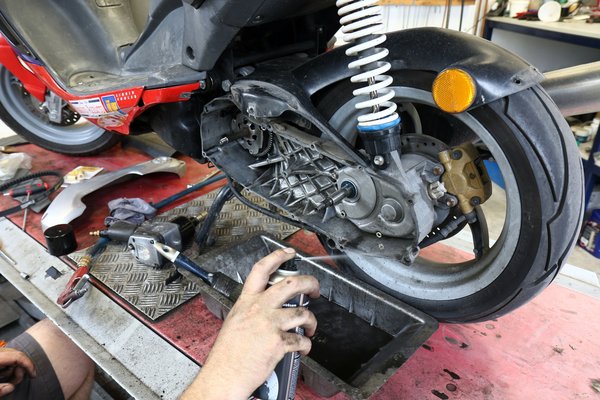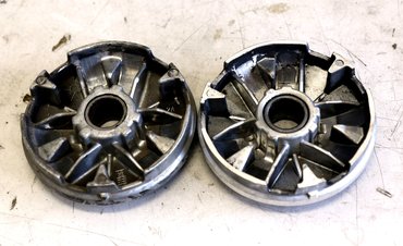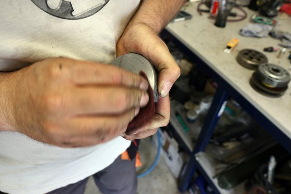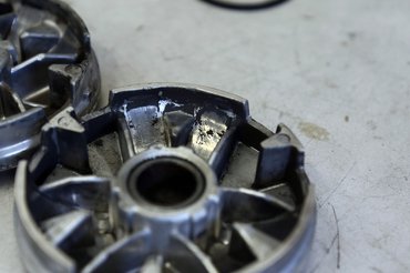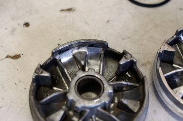 A szétbontás után megvizsgáltuk a hitvány anyagból igénytelenül megmunkált variátort, a viszonylagos újsága ellenére már látszódtak a felületén barázdák és kopások – mivel esély sem volt rá, hogy az SPD Scooter Weekendre tervezett edzésekre megérkezzen a tuti darab, Gábor ideiglenesen túrt a műhely egyik polcáról egy bontott, '98 végéről származó Minarellit, amit egy kis Scotch Brite-tal lepucolt és felérdesített. Szükség volt új variátor csőtengelyre is, az utángyártott már most alákopott volt, ezért egy használt, de gyári került bele, amivel a variátort összepróbálva egyből megszűnt a kotyogás. Görgőből ideiglenesen beraktunk egy szett Gianellit, amit eredetileg tuningkipufogó mellé adnak – nem csúcsminőség, inkább beállításhoz való, mint tartós üzemre, de a mi célunknak megfelel, míg megjönnek a rendelések.