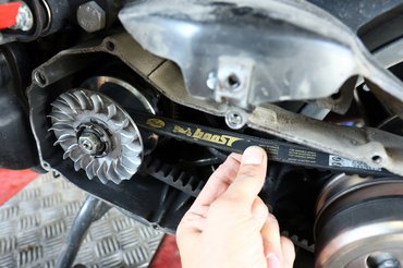 A variátor új, ahogyan a külső szíjtárcsa is, de mindkettő kínai. Az RMS hiába olasz cég, valójában csak csomagolóüzem – vannak jó termékeik, de variátor terén ne legyenek nagy elvárásaink. A szép sárga kontrasztrugó sem eredeti, Gábor megnyomogatta, és monda, ez bizony rohadt kemény. Egyből két teóriával is előállt: vagy a variátor nem megfelelő pályával rendelkezik, vagy nem megfelelő görgő van benne, esetleg ezek együtt – ez így elsőre három teóriának tűnik, de valóban ez az első, és mi ebben bíztunk, mert a második a szomorúbb, amikor már annyira szét van hajtva a motor, hogy csak a rommá forgatva képes menni, olyankor szokták így henkölni, nehogy betompuljon a beeső szíjtól.