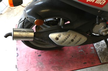 Gábor a kilencvenes évek eleje óta foglalkozik robogókkal, és elég hamar a versenypályák mellett kötött ki – rengeteg bajnok versenygépet épített, tudja, miről van szó, messziről kiszúrja a gyanús részleteket. A kipufogó miatt volt bennem némi feszkó, de megnyugtatott, a Sito Plus az lényegében gyári – ők a beszállítók, annyi a különbség, hogy az eredetin Aprilia felirat volt. A Sito egy nagy konszern, hozzájuk tartozik például a Leo Vince is, ők gyártják a Zip SP-hez is dobot, csak ott ESM van beleütve, ez tehát homológ.