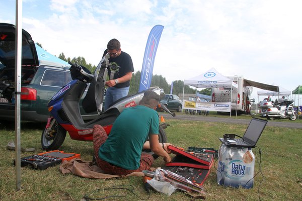 A Totalbike háztáji csapata az utolsó simításokat végzi a robogón, felpattintják a matricákat és bepattintják a Malossi variátort - Sturcz "Szerelj Szabadon" Anti Youtube videó alapján próbálja megfejteni a CVT hajtást. Elméletileg a variátorhoz adott súlyok megfelelőek lesznek, de egy finomhangolás benne van a pakliban - az a cél, hogy a célegyenes végére leforogjon a motor. Ez a cél egyelőre messze van, ugyanis a variátort és a kuplungot lefogató csavar annyira elnyíródott, hogy nem lehet visszatenni - ennek a beszerzése még folyik.